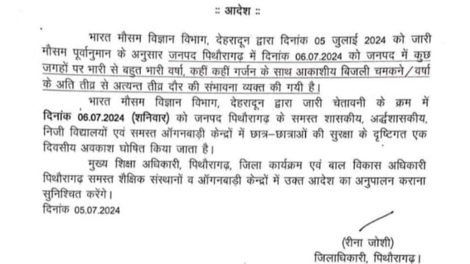 वहीं मौसम विभाग पूर्वानुमान के अनुसार जनपद ऊधमसिंह नगर, पिथौरागढ़ और नैनीताल में 6 जुलाई को कुछ जगहों पर भारी से बहुत भारी वर्षा, कहीं कहीं गर्जन के साथ आकाशीय बिजली चमकने / वर्षा के अति तीव्र से अत्यन्त तीव्र दौर की संभावना व्यक्त की गयी है। भारत मौसम विज्ञान विभाग, देहरादून द्वारा जारी चेतावनी के क्रम में दिनांक 6 जुलाई (शनिवार) को जनपद ऊधमसिंह नगर, पिथौरागढ़ और नैनीताल के समस्त शासकीय, अर्द्धशासकीय, निजी विद्यालयों एवं समस्त ऑगनबाड़ी केन्द्रों में छात्र-छात्राओं की सुरक्षा के दृष्टिगत एक दिवसीय अवकाश घोषित किया गया है।