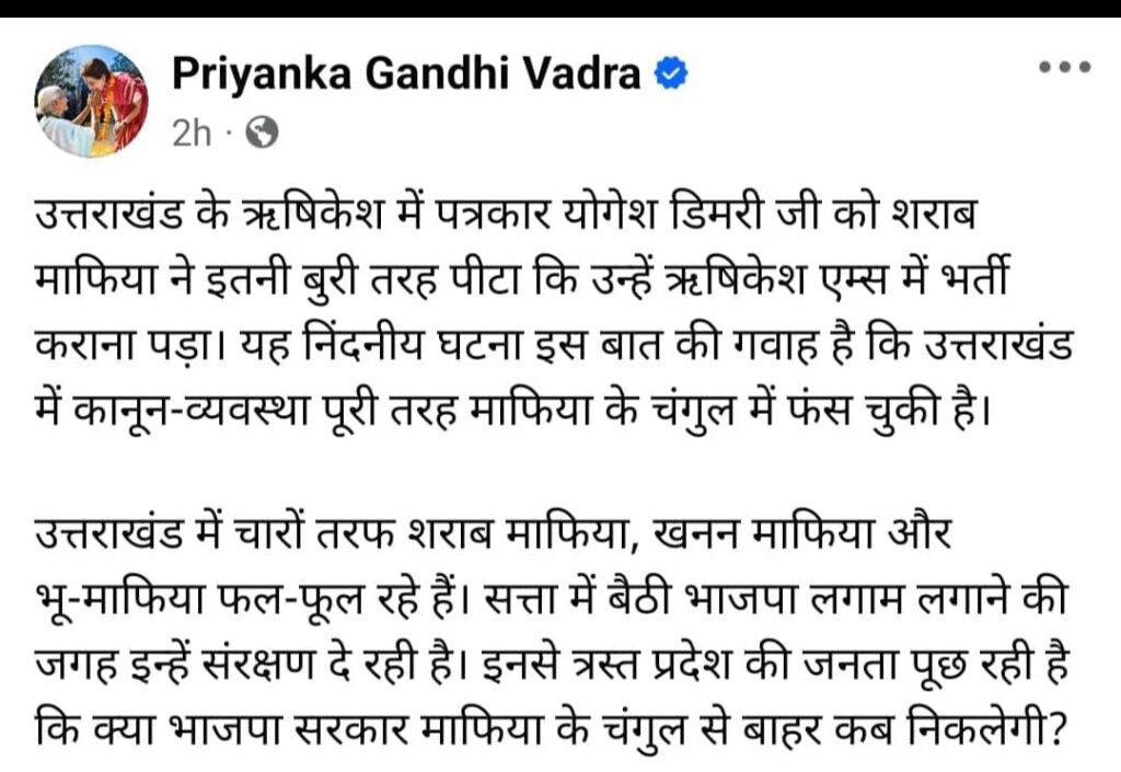 जिसमें उन्होंने उत्तराखंड की कानून व्यवस्था पर भी सवाल उठाए है उन्होंने अपनी वाल पर लिखा है कि उत्तराखंड के ऋषिकेश में पत्रकार योगेश डिमरी जी को शराब माफिया ने इतनी बुरी तरह पीटा कि उन्हें ऋषिकेश एम्स में भर्ती कराना पड़ा। यह निंदनीय घटना इस बात की गवाह है कि उत्तराखंड में कानून-व्यवस्था पूरी तरह माफिया के चंगुल में फंस चुकी है।