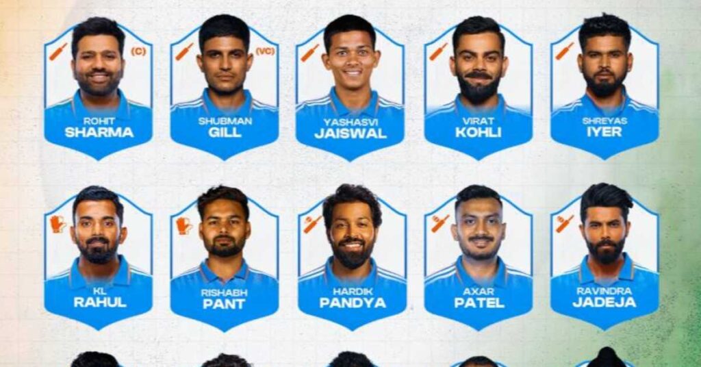 रोहित शर्मा (कप्तान), विराट कोहली, शुभमन गिल (उपकप्तान), श्रेयस अय्यर, केएल राहुल, हार्दिक पांड्या, अक्षर पटेल, वॉशिंगटन सुंदर, कुलदीप यादव, जसप्रीत बुमराह, मोहम्मद शमी, अर्शदीप सिंह, यशस्वी जायसवाल, ऋषभ पंत, रवींद्र जडेजा।