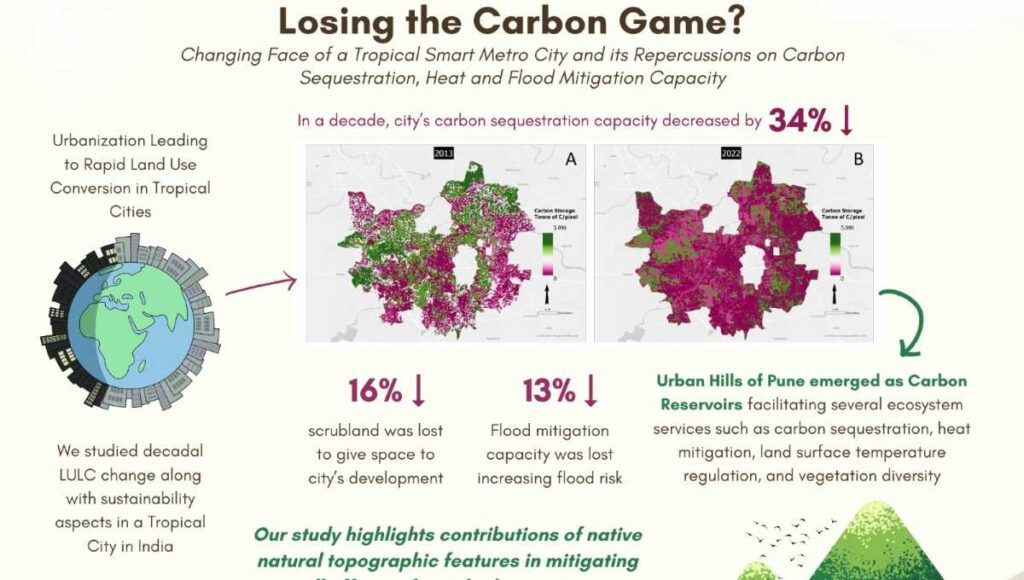 देहरादून – 23 मई 2025: पुणे ने बीते दस सालों में अपनी कार्बन सीक्वेस्ट्रेशन क्षमता में 34 प्रतिशत की गिरावट दर्ज की है, जो मुख्य रूप से तेज़ी से शहरी विकास की वजह से हुआ है। हाल ही में एमआईटी-वर्ल्ड पीस यूनिवर्सिटी के डॉ. पंकज कोपार्डे तथा सस्टेना ग्रीन्स एलएलपी की प्रतीक्षा चालके द्वारा साथ मिलकर की गई एक स्टडी के नतीजे में शहर की कार्बन डाइऑक्साइड (CO₂) नामक एक प्रमुख ग्रीनहाउस गैस को सोखने की क्षमता में इतनी बड़ी गिरावट की बात सामने आई है। “लूजिंग द कार्बन गेम? चेंजिंग फेस ऑफ ए ट्रॉपिकल स्मार्ट मेट्रो सिटी एंड इट्स रेपरकशंस ऑन कार्बन सीक्वेस्ट्रेशन, हीट एंड फ्लड मिटिगेशन कैपेसिटी” नाम से यह रिसर्च सस्टेनेबल फ्यूचर्स जर्नल में प्रकाशित की गई थी।